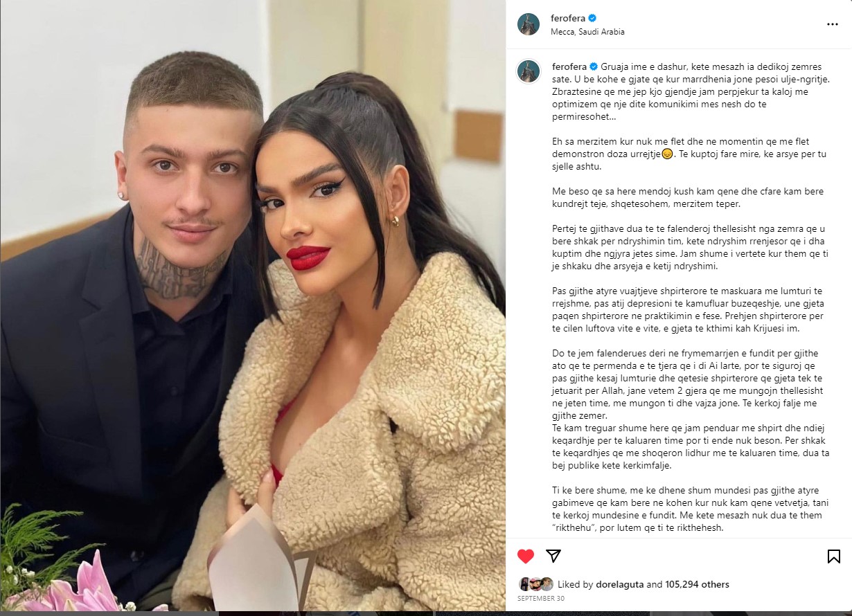 Fero nuk heq dorë nga Arbenita, rikthen postimin e kërkim faljes në ‘Instagram’