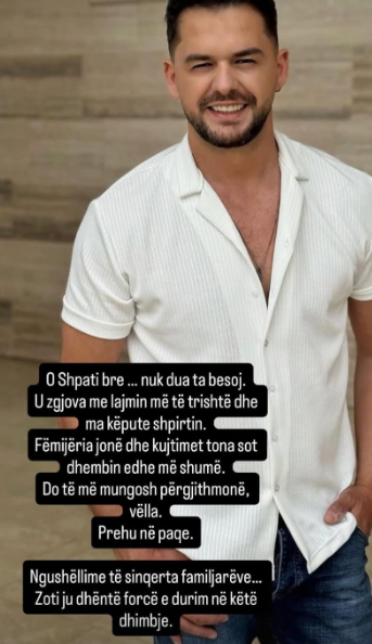 “O Shpati bre … nuk dua ta besoj. U zgjova me lajmin më të trishtë dhe më të këputë shpirtin. Fëmijëria jonë dhe kujtimet tona sot dhembjin edhe më shumë. Do të më mungosh përgjithmonë, vëlla. Prehu në paqe. Ngushëllime të sinqerta familjarëve… Zoti ju dhëntë forcë e durim në këtë dhimbje.”
