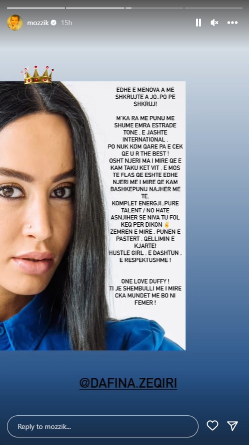 “Është njeriu më i mirë që e kam takuar këtë vit. E mos të flas që është edhe njeriu më i mirë që kam bashkëpunuar ndonjëherë me të. Komplet energji, talent, pa urrejtje, asnjëherë nuk e dëgjova duke folur keq për dikë. Zemrën e mirë, punën e pastër, qëllimin e qartë. E dashur, e respektueshme. Ti je shembulli më i mirë çka mundet me bo një femër.”, ka shkruar Mozzik./Lajmi.net/