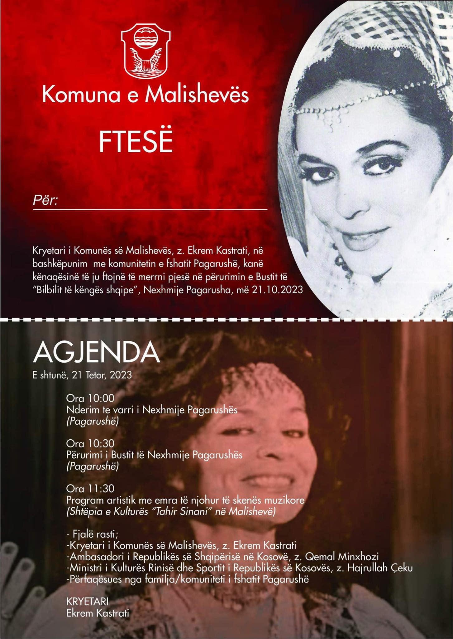 “Ju ftoj që të shtunën, të gjithë bashkë të bëheni pjesë e aktiviteteve tona sipas kësaj agjende, dhe ta nderojmë ashtu siç e meriton “Bilbili i këngës shqipe”, e madhja Nexhmije Pagarusha”.